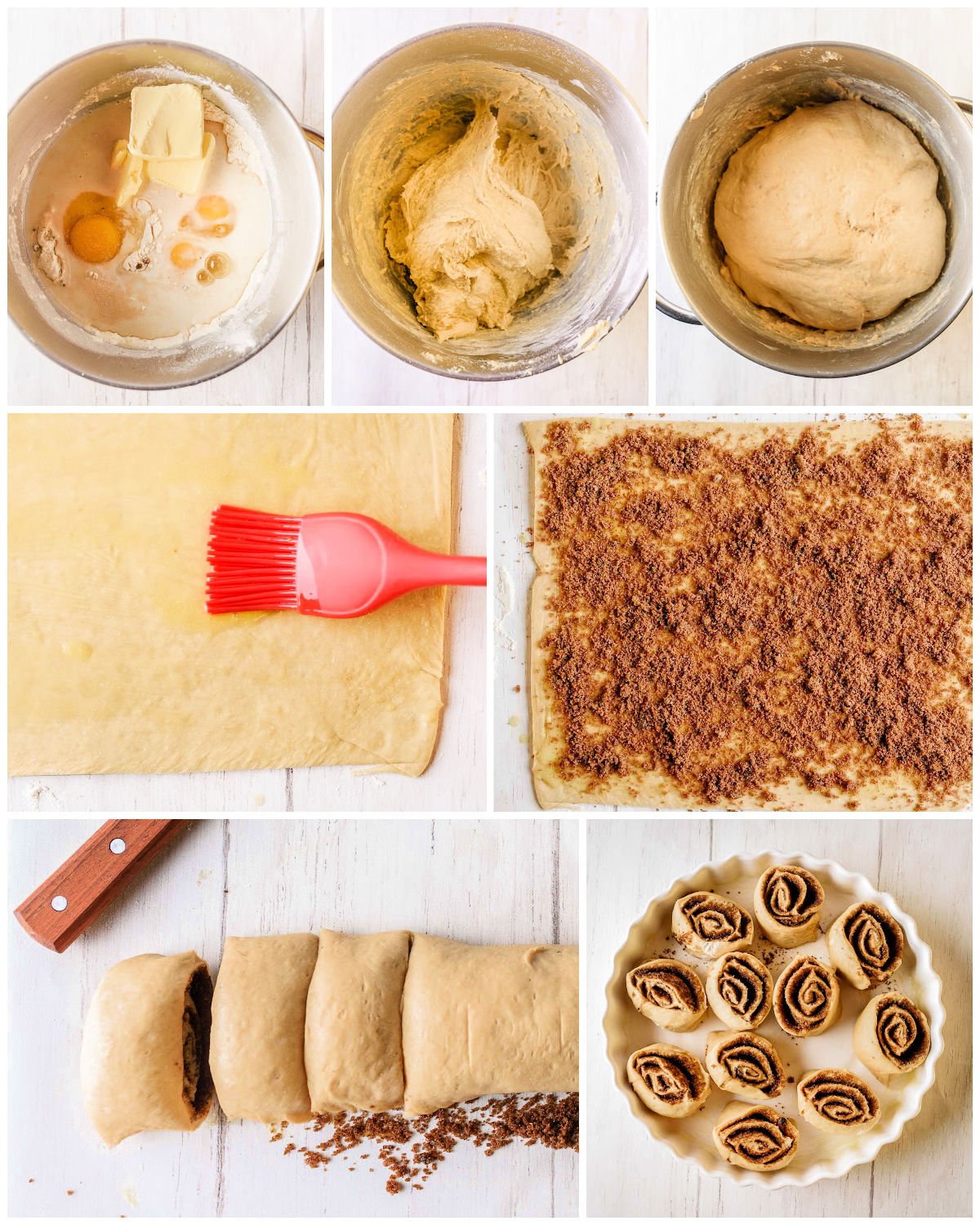 - Carefully roll the dough into a log. Try to keep it tight as you go. When you get to the clean edge, pull the dough up and over and pinch the dough together to seal the log. Now, use a sharp knife (or floss) to cut into 10 to 12 rolls. Place them in the prepared baking dish and cover them with plastic wrap and let rise again for another 25 to 30 minutes.