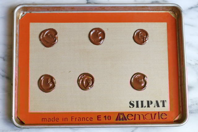 Spoon a small amount of chocolate onto a parchment paper lined, or Silpat lined baking sheet (pictured below).