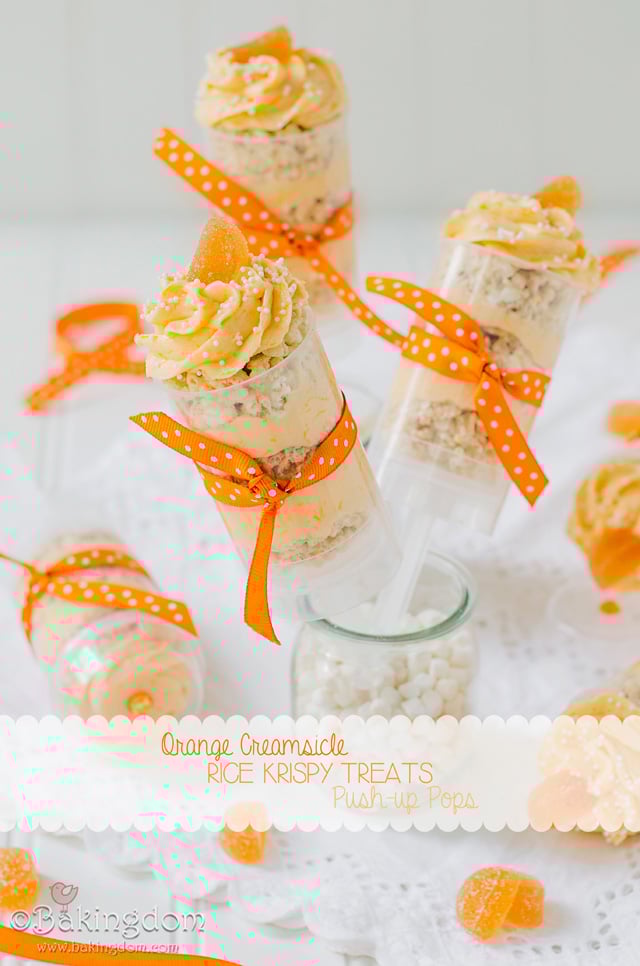 …it’s still too chilly ’round these parts for popsicles. Alright, then, well skip the frozen part. Instead, I stirred some orange goodness into rice krispy treats and threw them into some push-up pop containers with fluffy orange buttercream.