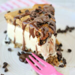 Once the ice cream "cake" is fully frozen, remove the outer ring of the springform pan, and with one hand on the top of the cookie cake, and one hand on the bottom of the springform pan, roll the outer edge of the ice cream "cake" onto a plate of mini chocolate chips. Return to the freezer until ready to serve.